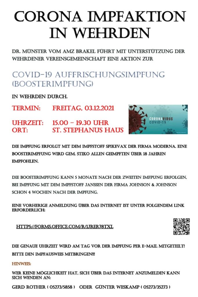 Dr. Münster vom AMZ Brakel bietet mit Unterstützung der Wehrdener Vereinsgemeinschaft am Freitag, den 03.12. 2021 ab 15:00 Uhr eine Covid-19 Boosterimpfung in Wehrden an.